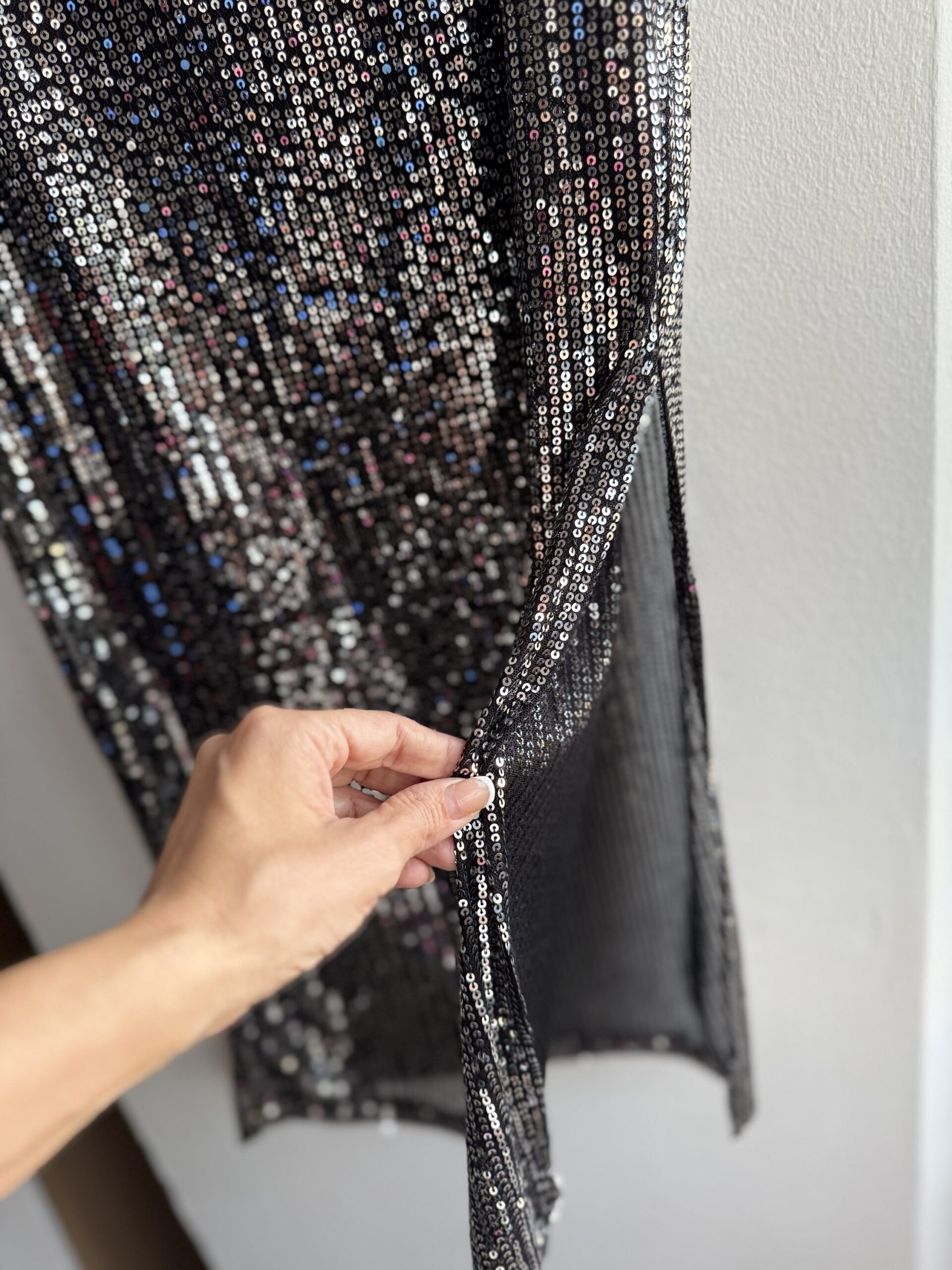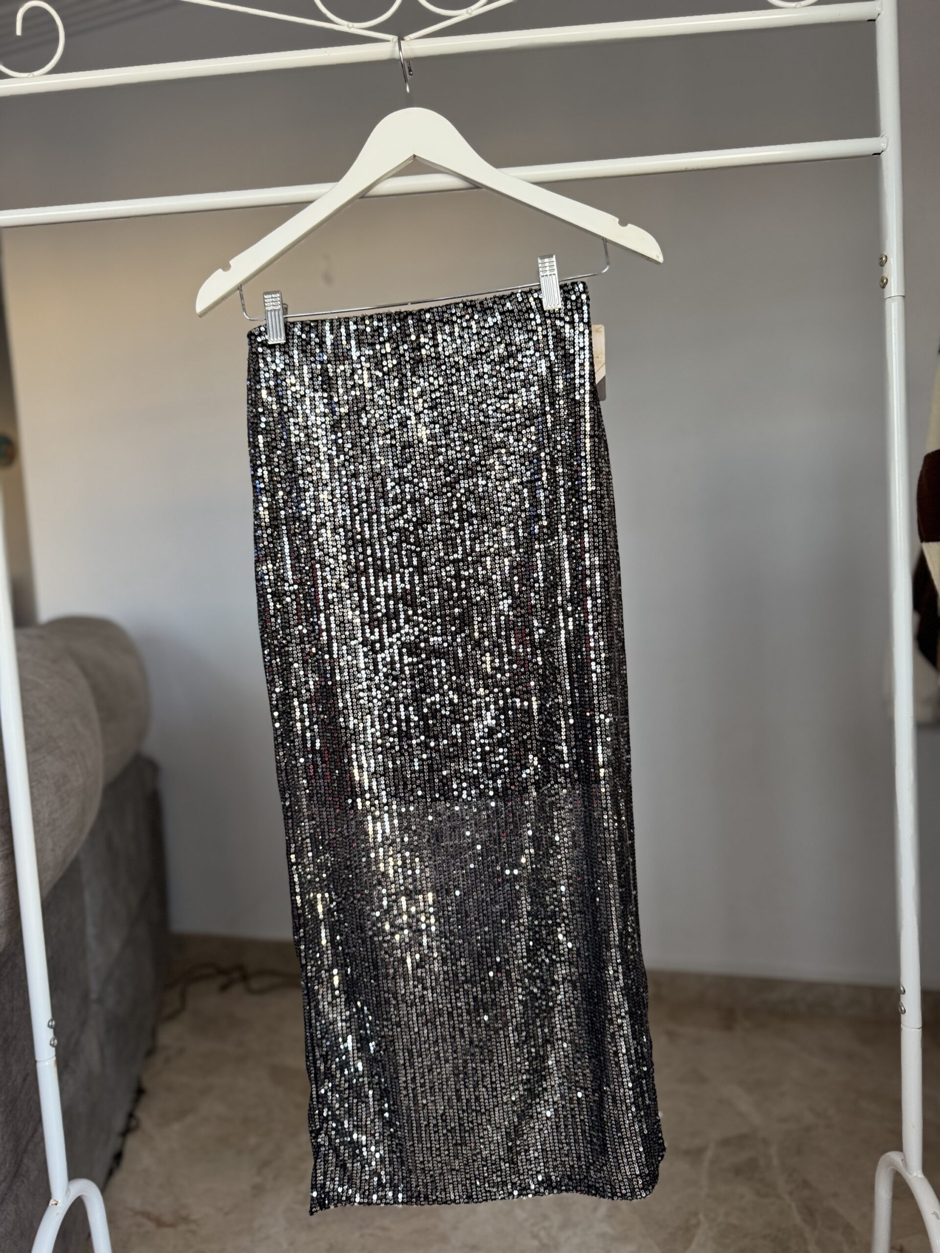 Falda con lentejuelas, midi, con apertura al lado. Talla única. Medidas cintura 84 largo 88.